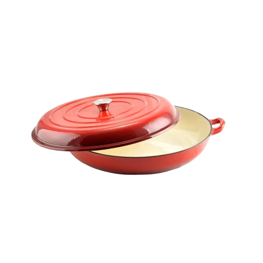 Perfect Home Zománcozott öntöttvas szeletsütő fedővel 30 cm. Anyaga: zománcozott öntöttvas. Mérete: 30 cm széles fülek nélkül; 37,5 cm széles a fülekkel együtt; 6 cm ma.gas fedő nélkül, 12,5 cm magas fedővel, belső átmérője 29,5 cm. Űrtartalma: 2,5 l. Bruttó súlya:6,8 kg. Nettó súlya: 6,5 kg. Használható: gáz-, illetve elektromos sütőben. Tisztítása: Minden használat után meleg mosószeres vízzel mossa el.