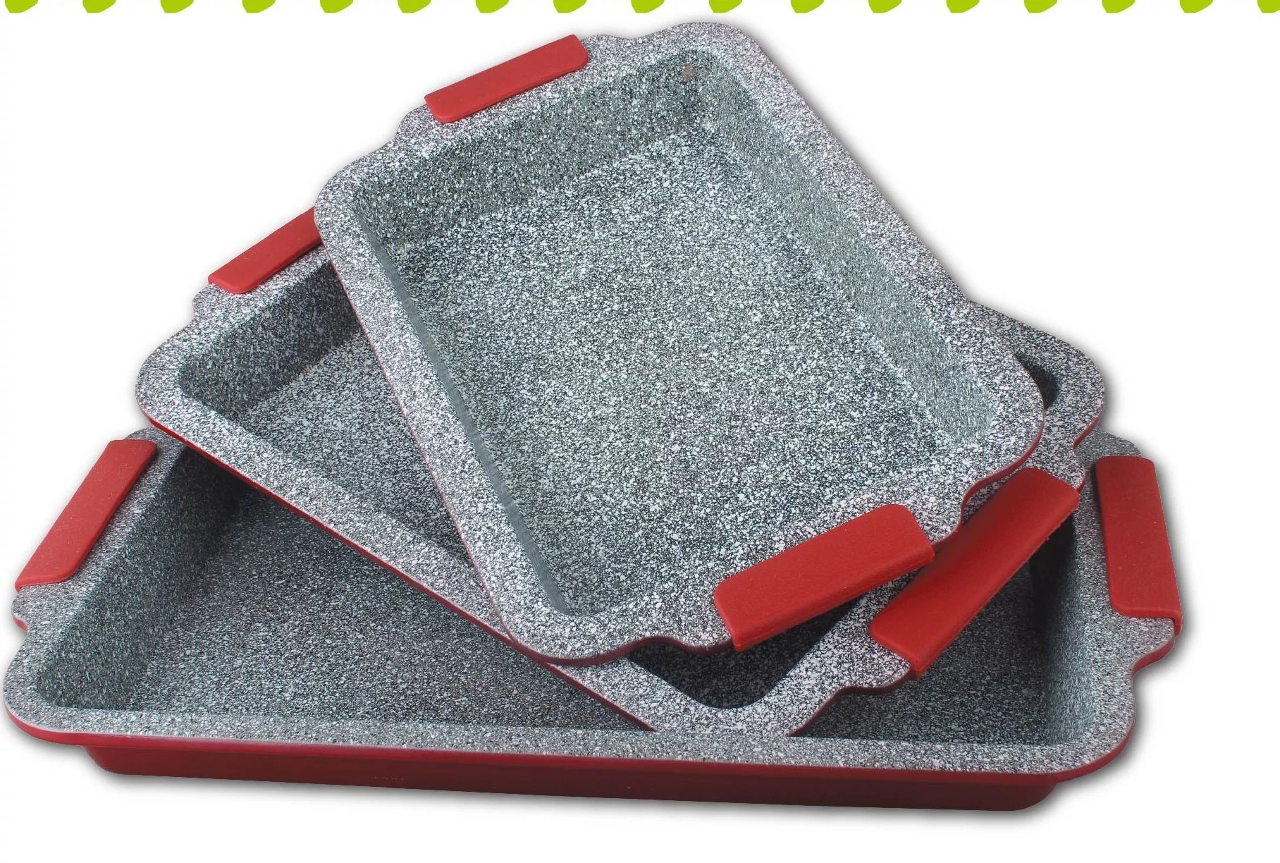 Remek tepsi kollekció, akár ajándéknak is. Több féle méretben kínáljuk. Tepsi szett 3 részes, szilikon fogantyúval, 0,6 mm 2 rétegű tapadásmentes bevonattal, 36,5x23x4,8cm, 40,5x27x4,5cm, 46x29,5x4,8cm t Belső méretek: 29x19xmélység. 4 cm, 33x23,5 x mélység: 4 cm, 39x26, mélység: 4 cm. A szilikon fogantyúval ellátott tepsi biztonságos fogást biztosít, így csúszásmentes. Használjon hőálló kesztyűt a biztonságos sütés érdekében, termékválasztékunkban talál több félét. A termékeket mosogatógépben is tisztítható.